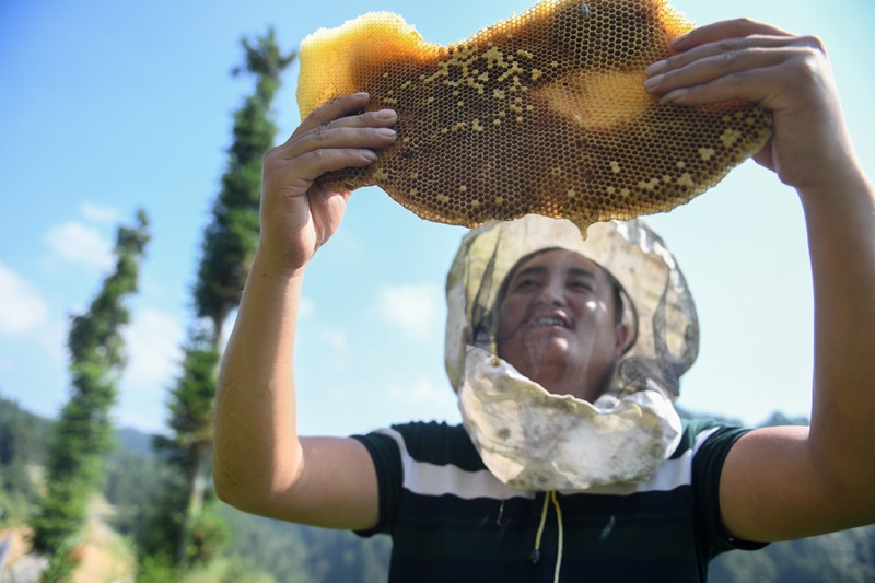 △十八洞村村民龍先蘭學(xué)習(xí)養(yǎng)蜂技術(shù),因地制宜發(fā)展養(yǎng)蜂產(chǎn)業(yè),逐漸成為養(yǎng)蜂大戶,還收獲了甜蜜的愛(ài)情。