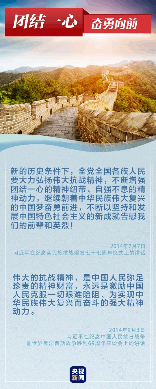 “偉大的抗戰(zhàn)精神,永遠(yuǎn)是激勵(lì)中國(guó)人民克服一切艱難險(xiǎn)阻、為實(shí)現(xiàn)中華民族偉大復(fù)興而奮斗的強(qiáng)大精神動(dòng)力?!薄罢x必勝!和平必勝!人民必勝!”黨的十八大以來(lái),習(xí)近平總書記多次談到抗戰(zhàn)精神。讓我們重溫總書記重要論述,銘記歷史、奮勇向前。