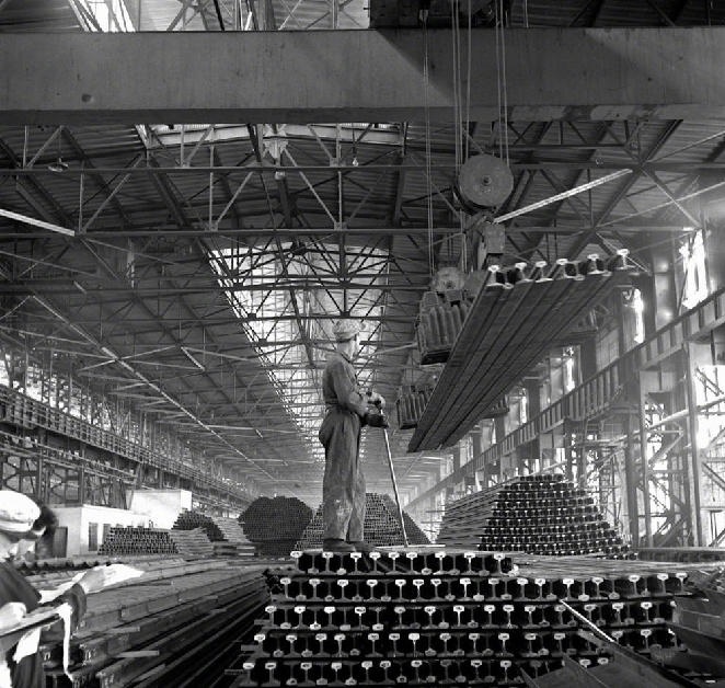 “一五”期間,鞍鋼興建的第一座大型軋鋼廠生產能力已迅速超過設計標準。這是這個廠生產的大批鋼軌(攝于1957年4月)。