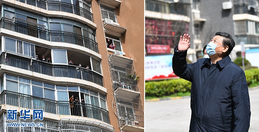 3月10日,習(xí)近平專門赴湖北省武漢市考察新冠肺炎疫情防控工作。這是習(xí)近平在東湖新城社區(qū)考察時(shí),向在家隔離居住的居民揮手致意、表示慰問(wèn)(拼版照片)。