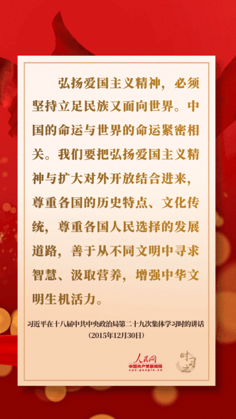 弘揚(yáng)愛國主義精神,必須堅持立足民族又面向世界。中國的命運(yùn)與世界的命運(yùn)緊密相關(guān)。我們要把弘揚(yáng)愛國主義精神與擴(kuò)大對外開放結(jié)合進(jìn)來,尊重各國的歷史特點(diǎn)、文化傳統(tǒng),尊重各國人民選擇的發(fā)展道路,善于從不同文明中尋求智慧、汲取營養(yǎng),增強(qiáng)中華文明生機(jī)活力。