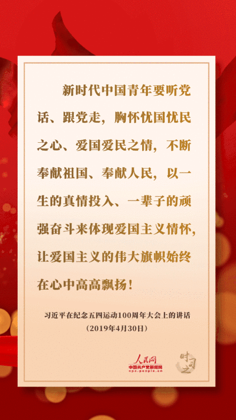 新時代中國青年要聽黨話、跟黨走,胸懷憂國憂民之心、愛國愛民之情,不斷奉獻(xiàn)祖國、奉獻(xiàn)人民,以一生的真情投入、一輩子的頑強(qiáng)奮斗來體現(xiàn)愛國主義情懷,讓愛國主義的偉大旗幟始終在心中高高飄揚(yáng)!