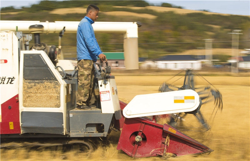 在吉林省延邊州和龍市光東村稻田里,農(nóng)民駕駛收割機收獲成熟的水稻(2019年10月10日攝)。新華社記者許暢攝