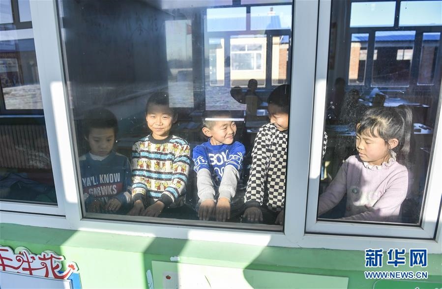 吉林省德惠市邊崗鄉(xiāng)臥虎村小學(xué)學(xué)生在戶外活動后圍著教室內(nèi)的環(huán)流散熱器取暖(2018年12月26日攝)。新華社記者許暢攝