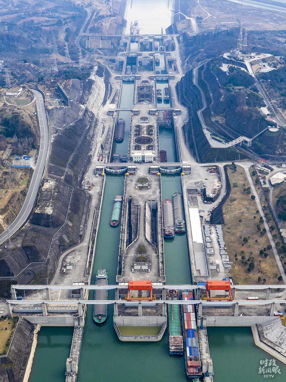 △1月10日,湖北宜昌,船舶有序行駛在三峽五級船閘。