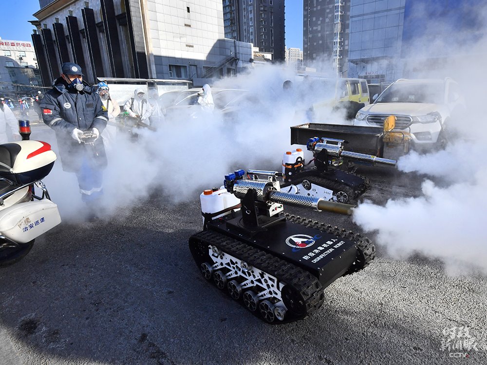 △1月9日,北京岳各莊市場,2臺(tái)“坦克”防疫消殺機(jī)器人對市場進(jìn)行消殺。這種消殺“新裝備”裝有大容量藥壺,每小時(shí)消殺約10000平方米。