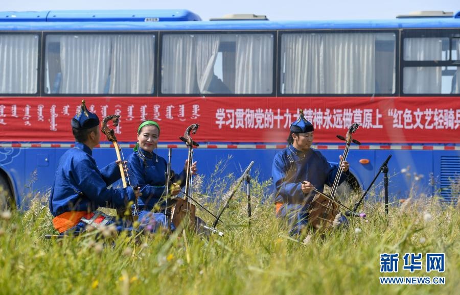 錫林郭勒盟烏蘭牧騎隊(duì)員在草原上為牧民演出(資料照片)。新華社發(fā)
