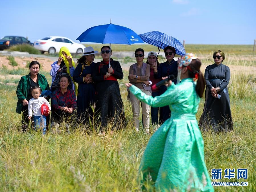 2018年9月13日,在內(nèi)蒙古自治區(qū)錫林郭勒盟鑲黃旗寶格達(dá)音高勒蘇木浩尼欽哈夏圖嘎查的一處草場,鑲黃旗烏蘭牧騎的隊(duì)員在為牧民表演文藝節(jié)目。新華社記者