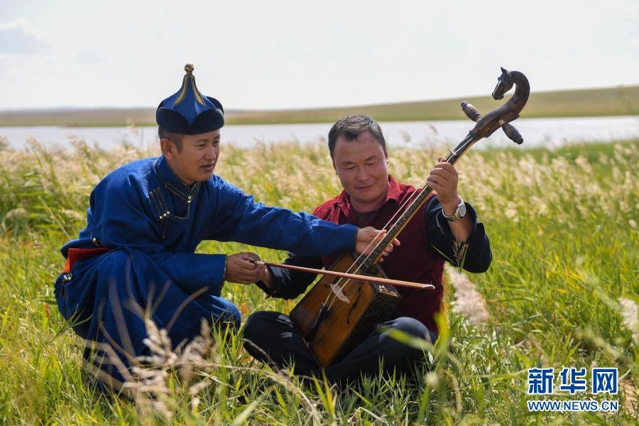2018年9月13日,在內(nèi)蒙古自治區(qū)錫林郭勒盟鑲黃旗寶格達(dá)音高勒蘇木浩尼欽哈夏圖嘎查的一處草場,演出結(jié)束后,鑲黃旗烏蘭牧騎的隊(duì)員教牧民拉馬頭琴。新華社記者 彭源 攝