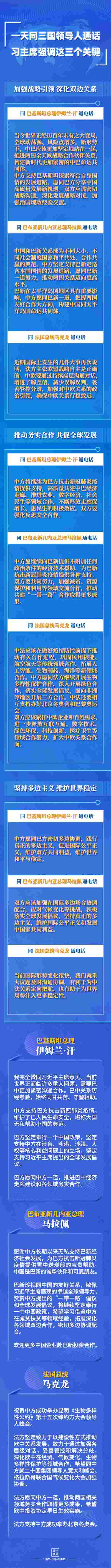 中國和巴基斯坦是“全天候戰(zhàn)略合作伙伴關(guān)系”;中國和巴新是“不同大小、不同社會制度國家和平共處、合作共贏的典范”;中國和法國同為聯(lián)合國安理會常任理事國……3次通話內(nèi)容豐富,“第一報(bào)道”為您梳理——