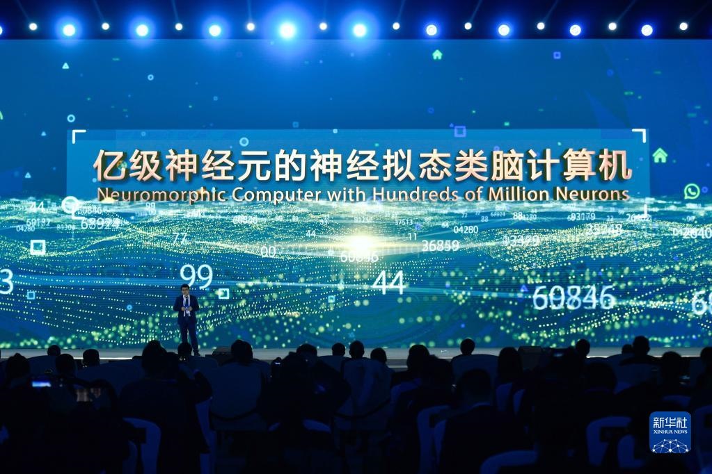 浙江大學(xué)、之江實(shí)驗(yàn)室代表在“世界互聯(lián)網(wǎng)領(lǐng)先科技成果發(fā)布”活動(dòng)上介紹“億級(jí)神經(jīng)元的神經(jīng)擬態(tài)類腦計(jì)算機(jī)”(2020年11月23日攝)。新華社記者 黃宗治 攝