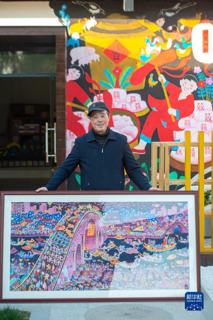 浙江省嘉興市秀洲區(qū)油車港鎮(zhèn)勝豐村村民張金泉與自己的畫作《國(guó)泰民安》合影(2020年12月15日攝)。新華社記者 江漢 攝