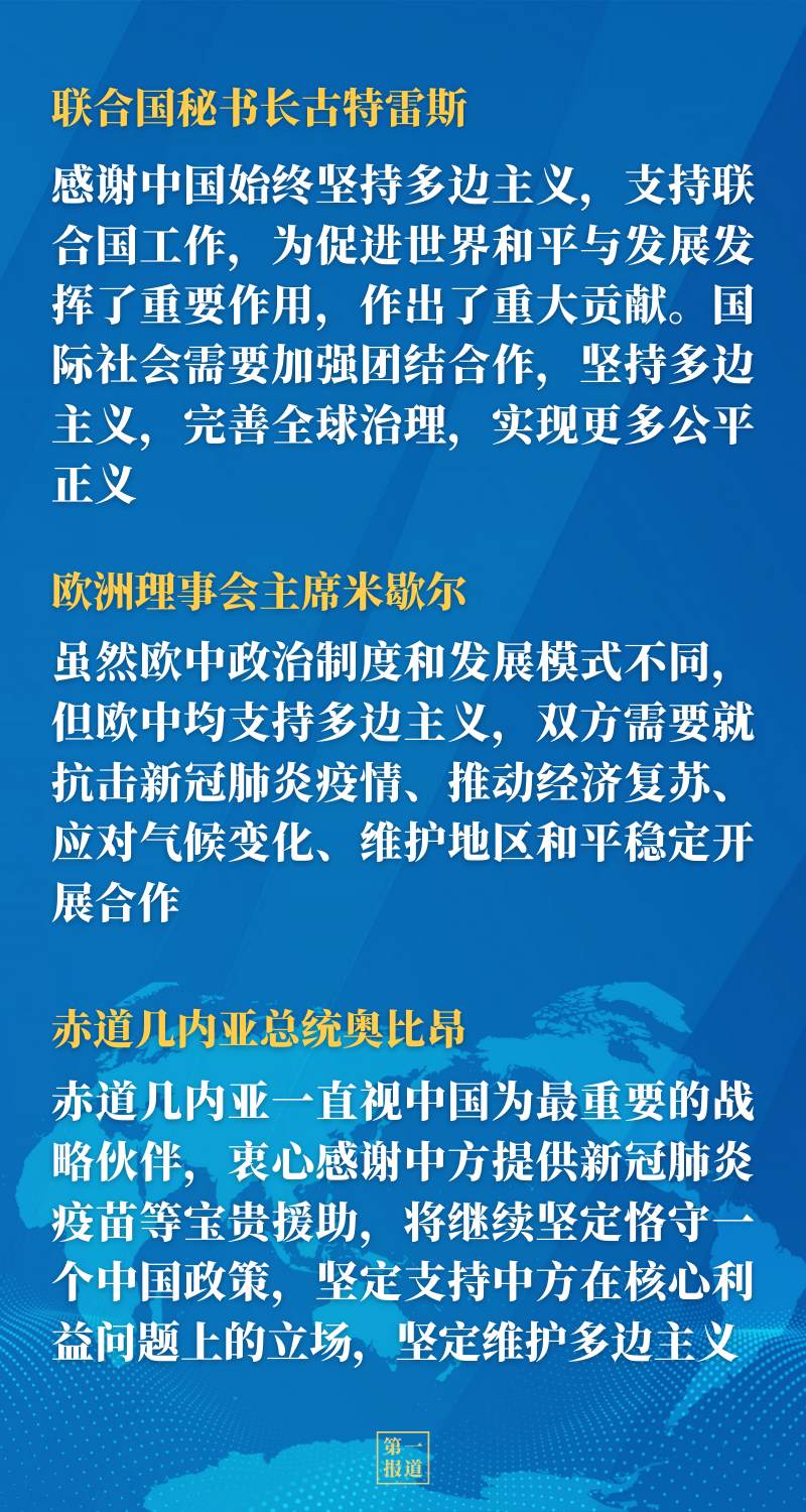 在同聯(lián)合國秘書長古特雷斯、歐洲理事會主席米歇爾、巴基斯坦總理伊姆蘭·汗、巴布亞新幾內亞總理馬拉佩、赤道幾內亞總統(tǒng)奧比昂等國際和地區(qū)組織以及國家領導人的交流中,習近平主席都分別同各方就堅持真正的多邊主義深入交流,獲得積極反饋——