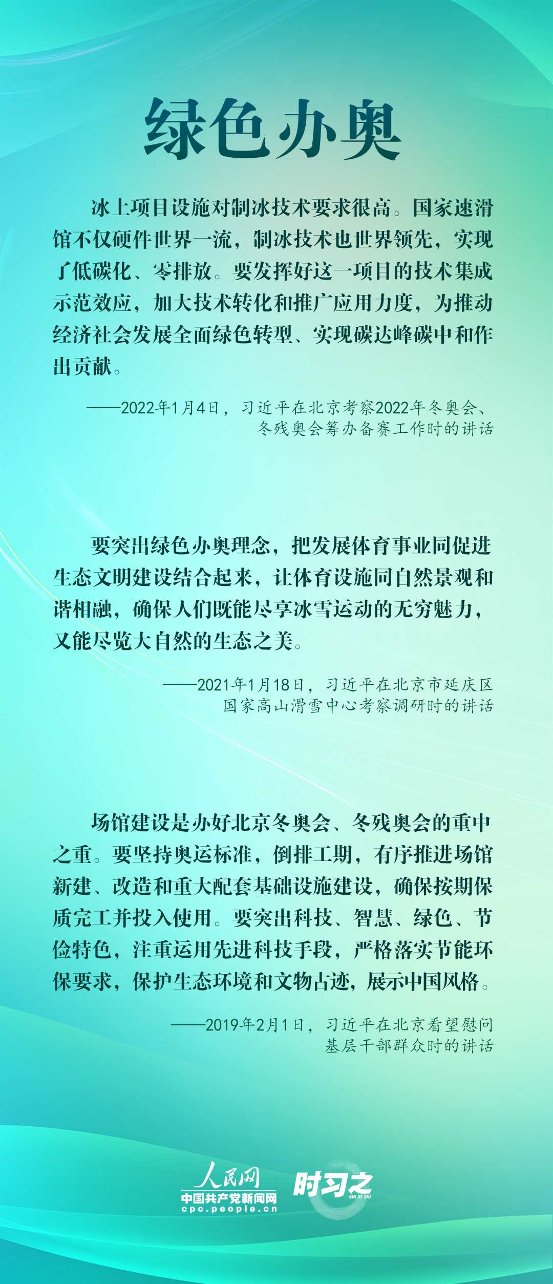1月4日,習(xí)近平在北京考察2022年冬奧會、冬殘奧會籌辦備賽工作,指出“要堅持綠色辦奧、共享辦奧、開放辦奧、廉潔辦奧的理念,突出科技、智慧、綠色、節(jié)儉特色”。辦好北京冬奧會、冬殘奧會,是中國向國際社會作出的莊嚴(yán)承諾。習(xí)近平多次調(diào)研并強調(diào)綠色、共享、開放、廉潔的辦奧理念。