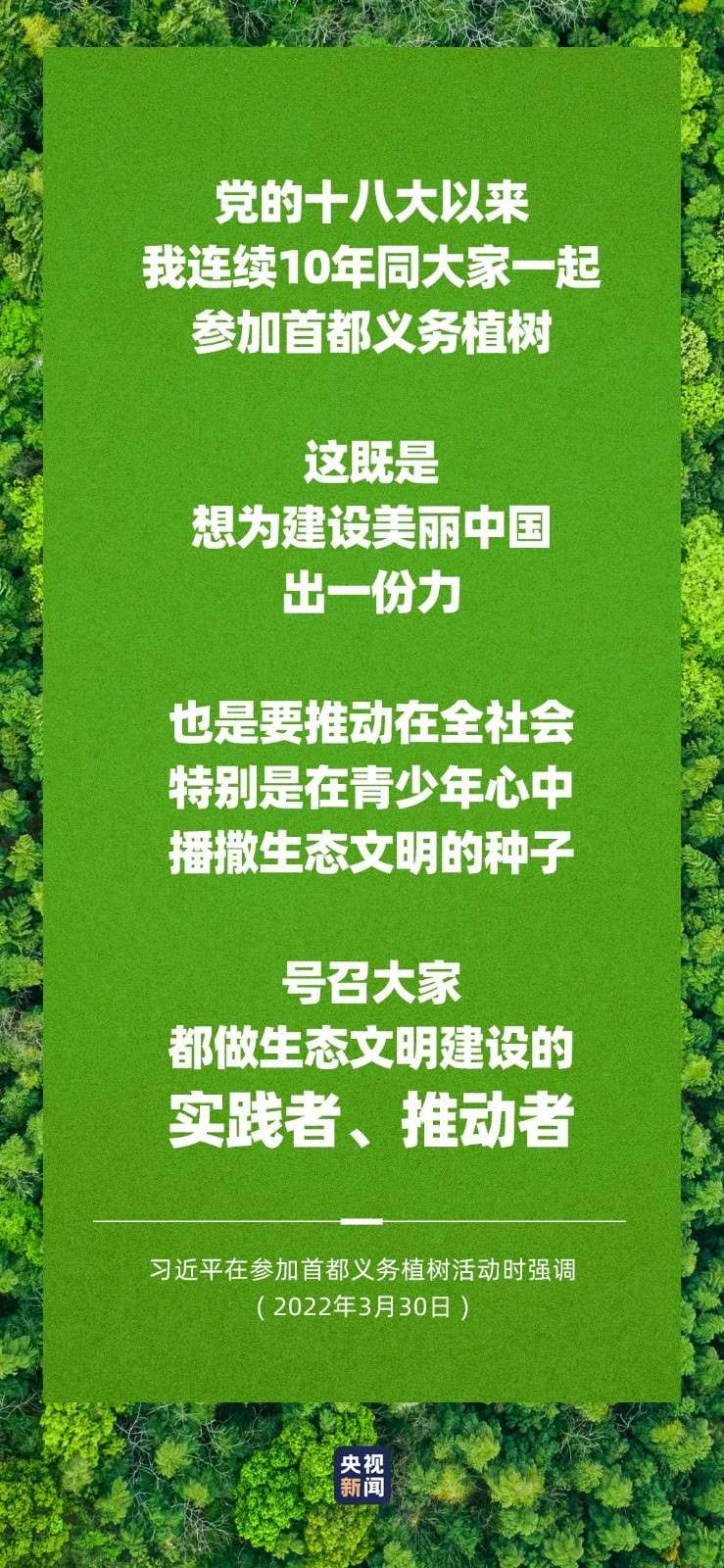 中共中央總書記、國家主席、中央軍委主席習近平3月30日在參加首都義務植樹活動時強調(diào),黨的十八大以來,我連續(xù)10年同大家一起參加首都義務植樹,這既是想為建設美麗中國出一份力,也是要推動在全社會特別是在青少年心中播撒生態(tài)文明的種子,號召大家都做生態(tài)文明建設的實踐者、推動者,持之以恒,久久為功,讓我們的祖國天更藍、山更綠、水更清、生態(tài)環(huán)境更美好。