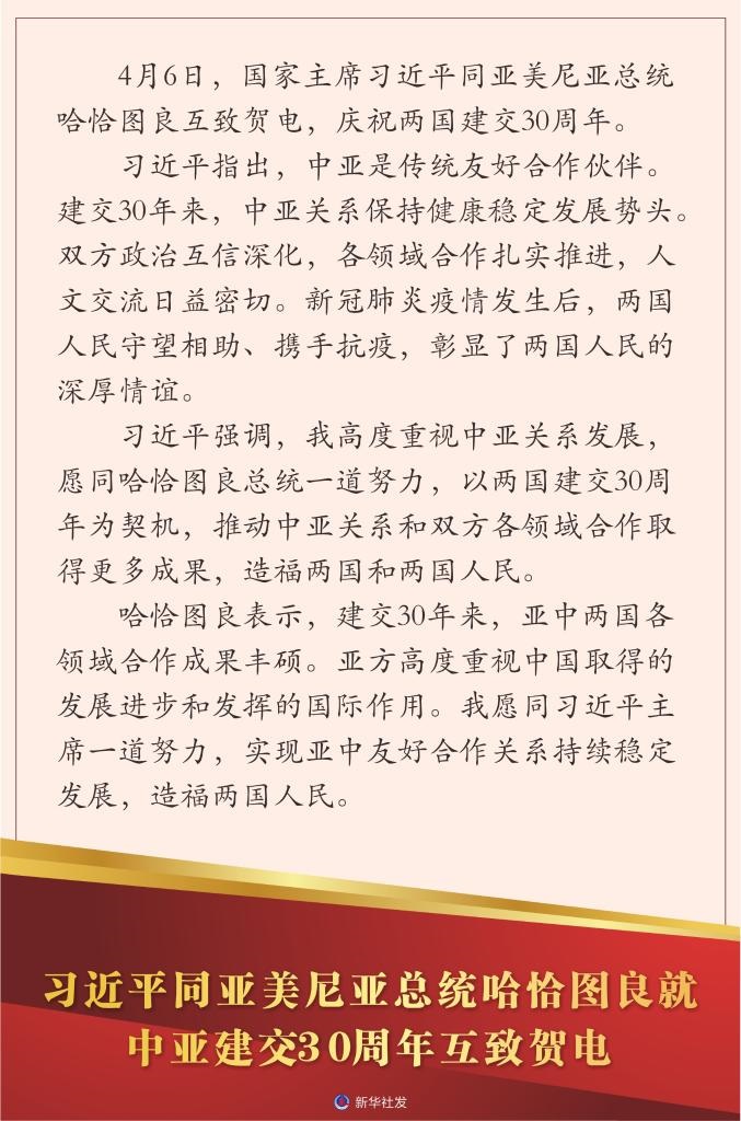 新華社北京4月6日電 4月6日,國(guó)家主席習(xí)近平同亞美尼亞總統(tǒng)哈恰圖良互致賀電,慶祝兩國(guó)建交30周年。