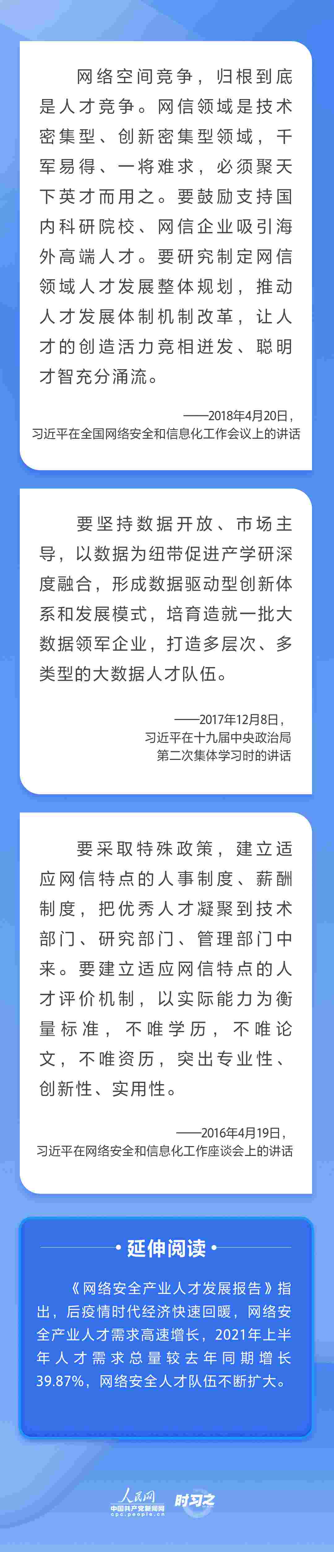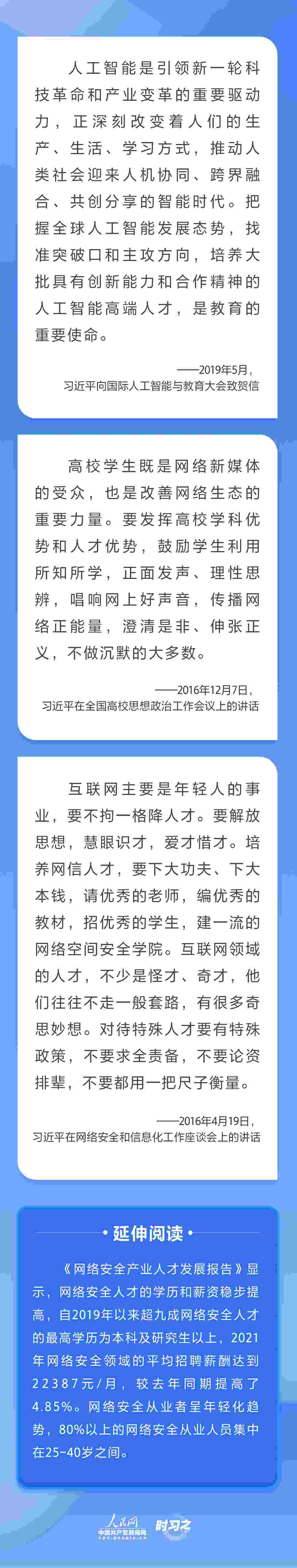 “網(wǎng)信領域是技術密集型、創(chuàng)新密集型領域,千軍易得、一將難求,必須聚天下英才而用之。”黨的十八大以來,習近平總書記多次就網(wǎng)信事業(yè)發(fā)展作出重要論述,并將抓好人才工作擺在治國理政的重要位置,為新時代網(wǎng)信人才工作和網(wǎng)信人才事業(yè)發(fā)展指明了前進方向。