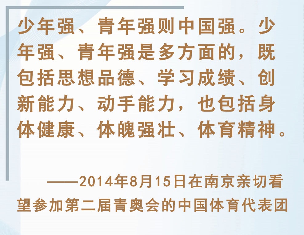 青少年是祖國的未來、民族的希望。強(qiáng)健的體魄是青少年成長成才的重要前提。對加強(qiáng)體育教育,增強(qiáng)青少年體質(zhì),習(xí)近平總書記念茲在茲。