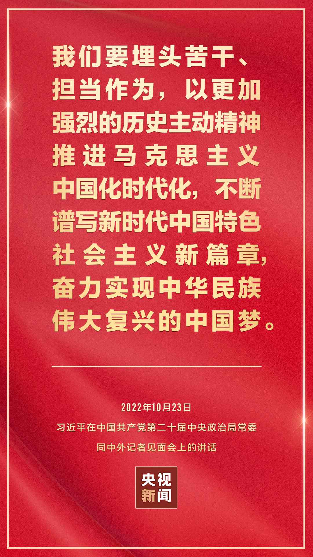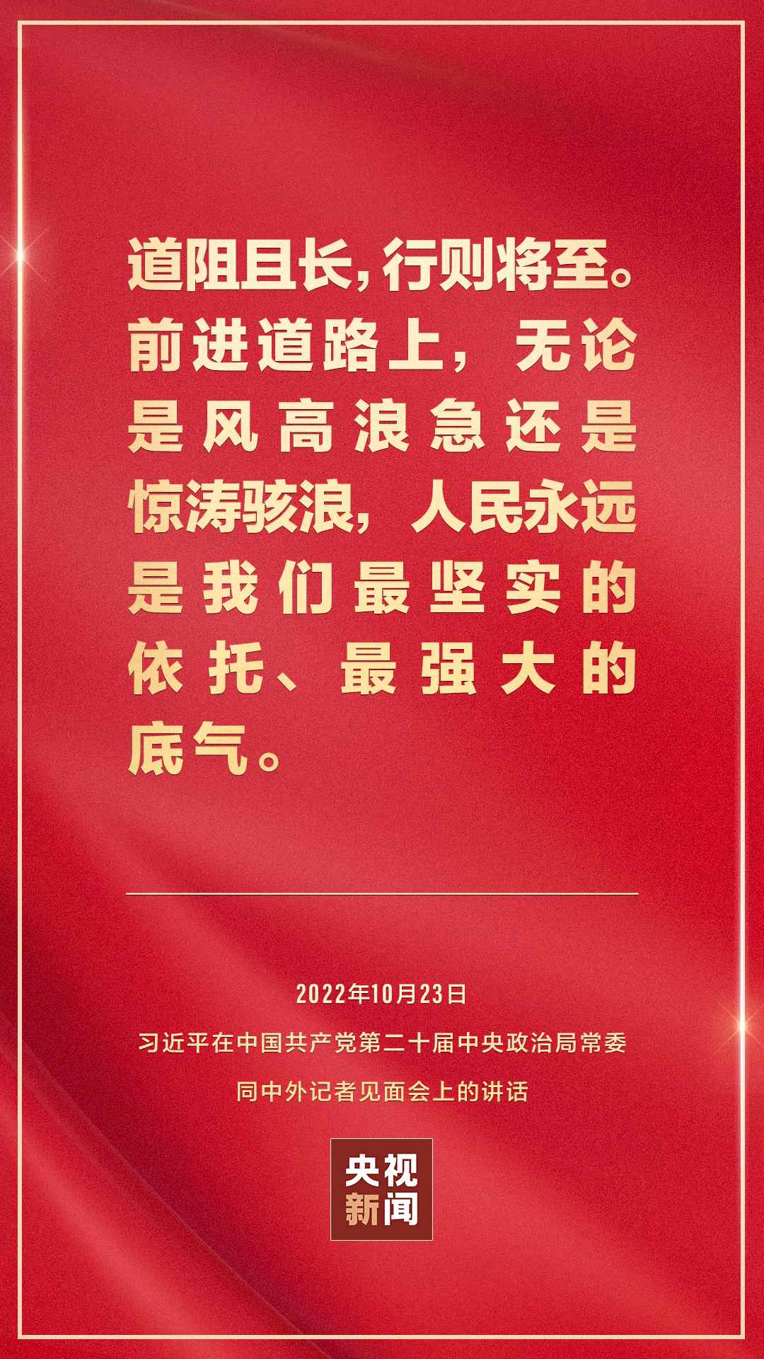 在中國共產(chǎn)黨第二十屆中央委員會(huì)第一次全體會(huì)議上當(dāng)選的中共中央總書記習(xí)近平和中共中央政治局常委李強(qiáng)、趙樂際、王滬寧、蔡奇、丁薛祥、李希,23日中午在人民大會(huì)堂同采訪中共二十大的中外記者見面。習(xí)近平發(fā)表重要講話。