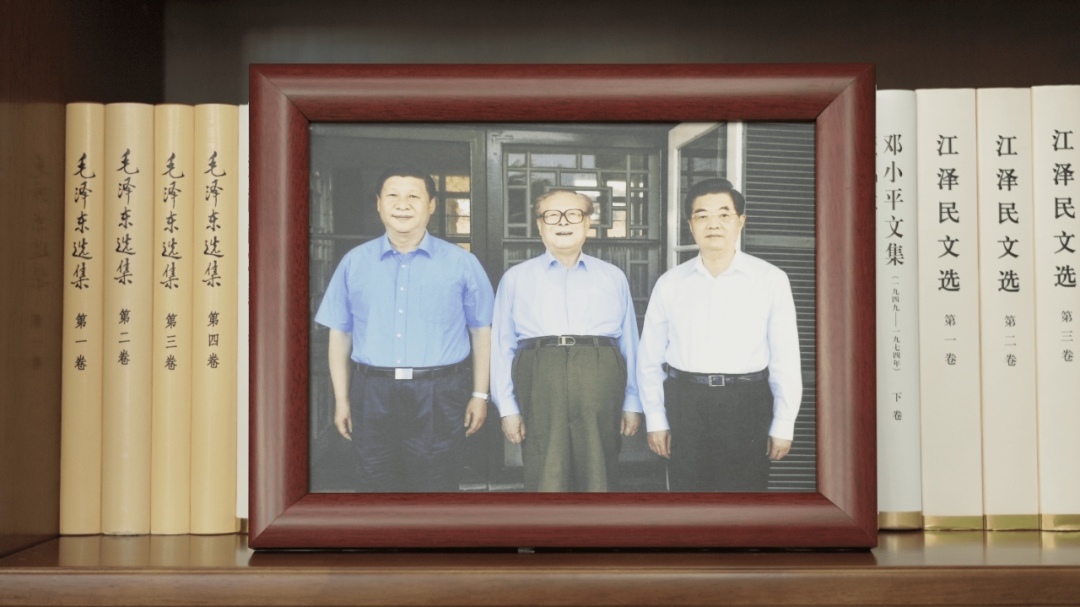書架上擺放著一張合影。這是1999年9月30日,江澤民同志、朱镕基同志、習(xí)仲勛同志在慶祝建國五十周年招待會(huì)上。這張照片第一次出現(xiàn)在習(xí)近平總書記的書架上。