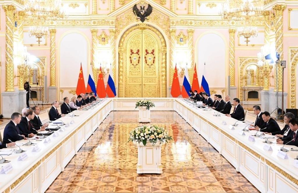 當(dāng)?shù)貢r(shí)間3月21日下午,國(guó)家主席習(xí)近平在莫斯科克里姆林宮同俄羅斯總統(tǒng)普京舉行會(huì)談。這是兩國(guó)元首舉行大范圍會(huì)談。新華社記者 申宏 攝