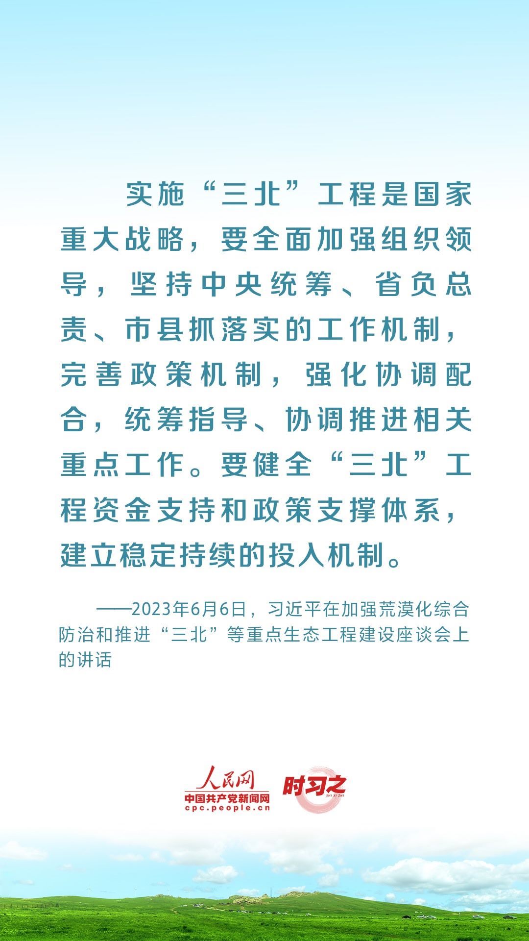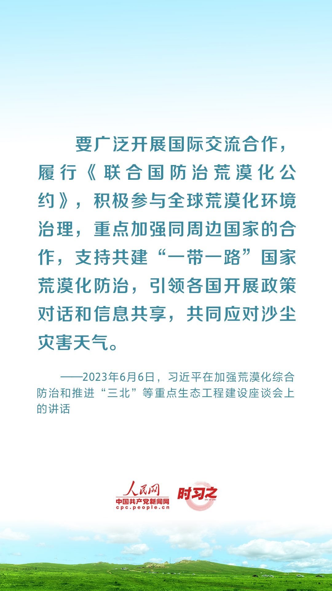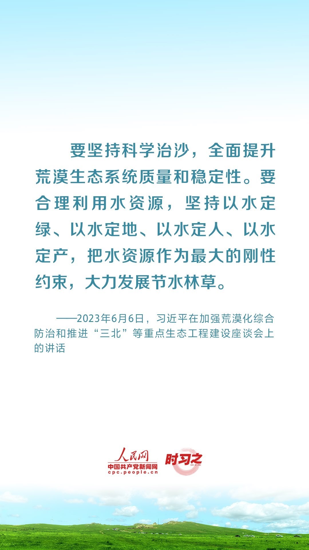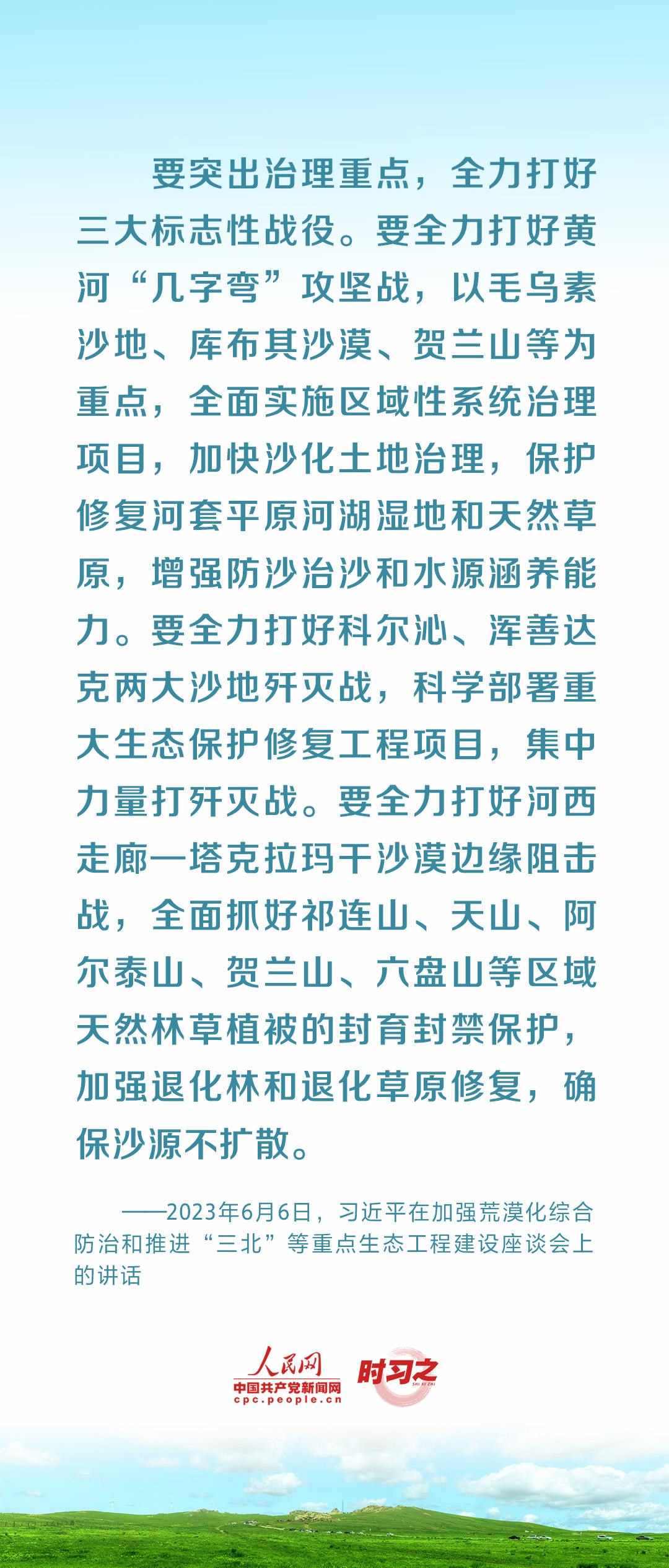 2023年6月5日至6日,中共中央總書(shū)記、國(guó)家主席、中央軍委主席習(xí)近平在內(nèi)蒙古自治區(qū)巴彥淖爾市考察,主持召開(kāi)加強(qiáng)荒漠化綜合防治和推進(jìn)“三北”等重點(diǎn)生態(tài)工程建設(shè)座談會(huì)并發(fā)表重要講話(huà)。座談會(huì)上,習(xí)近平對(duì)走好中國(guó)特色防沙治沙道路提出工作要求。