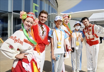 △6月15日,來自白俄羅斯的演員在表演結束后與志愿者合影。當日,上海合作組織產(chǎn)業(yè)鏈供應鏈論壇暨2023上合國際投資貿易博覽會在青島開幕。