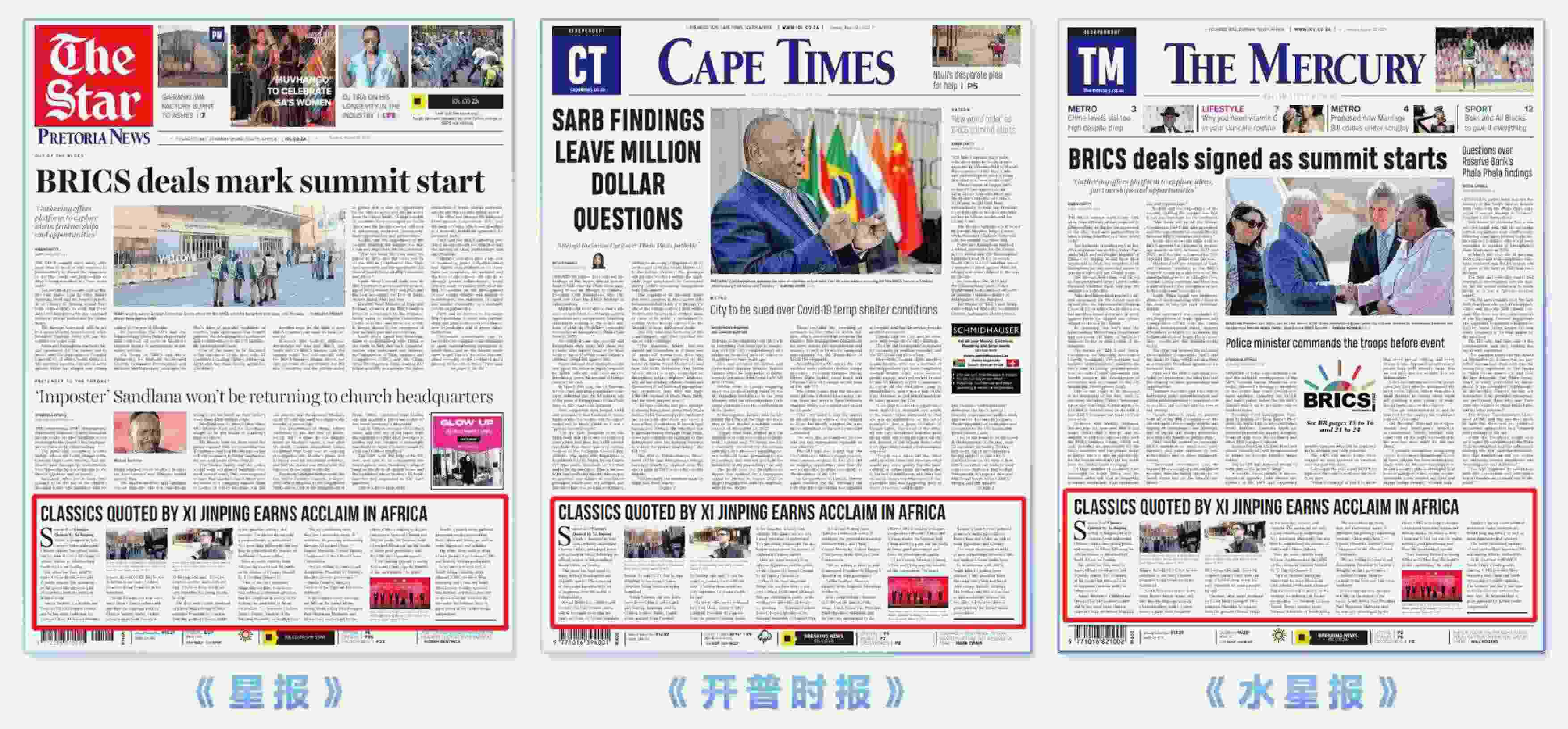 8月22日出版的南非三大主流報(bào)刊南非《星報(bào)》、《開(kāi)普時(shí)報(bào)》、《水星報(bào)》,連續(xù)第二天在頭版顯著位置發(fā)表文章。文章指出,《平“語(yǔ)”近人——習(xí)近平喜歡的典故》第二季周日(8月20日)在南非約翰內(nèi)斯堡正式發(fā)布后,在非洲贏得了廣泛好評(píng)。系列節(jié)目已經(jīng)在多家非洲廣播公司播出,并在公共場(chǎng)所大屏幕展示,這些語(yǔ)錄吸引了大量非洲受眾觀看并獲得積極反響。