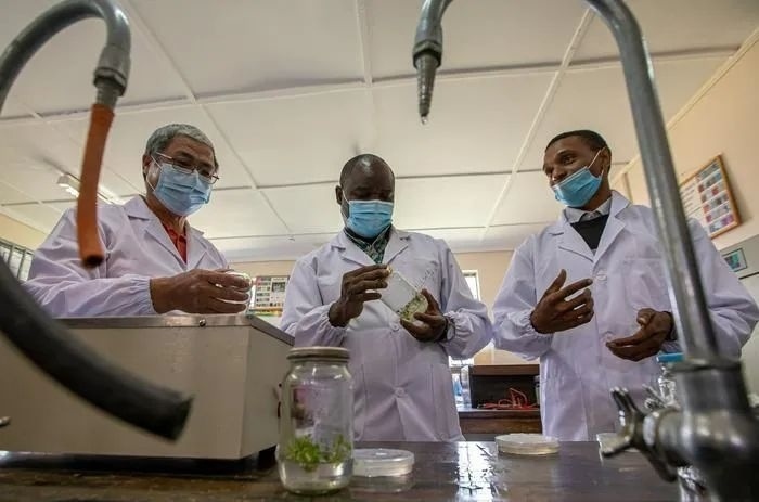 △2021年6月25日,肯尼亞,來自中國的農(nóng)學(xué)教授與肯尼亞農(nóng)業(yè)專家、肯方研究生在實(shí)驗(yàn)室內(nèi)交流實(shí)驗(yàn)成果。