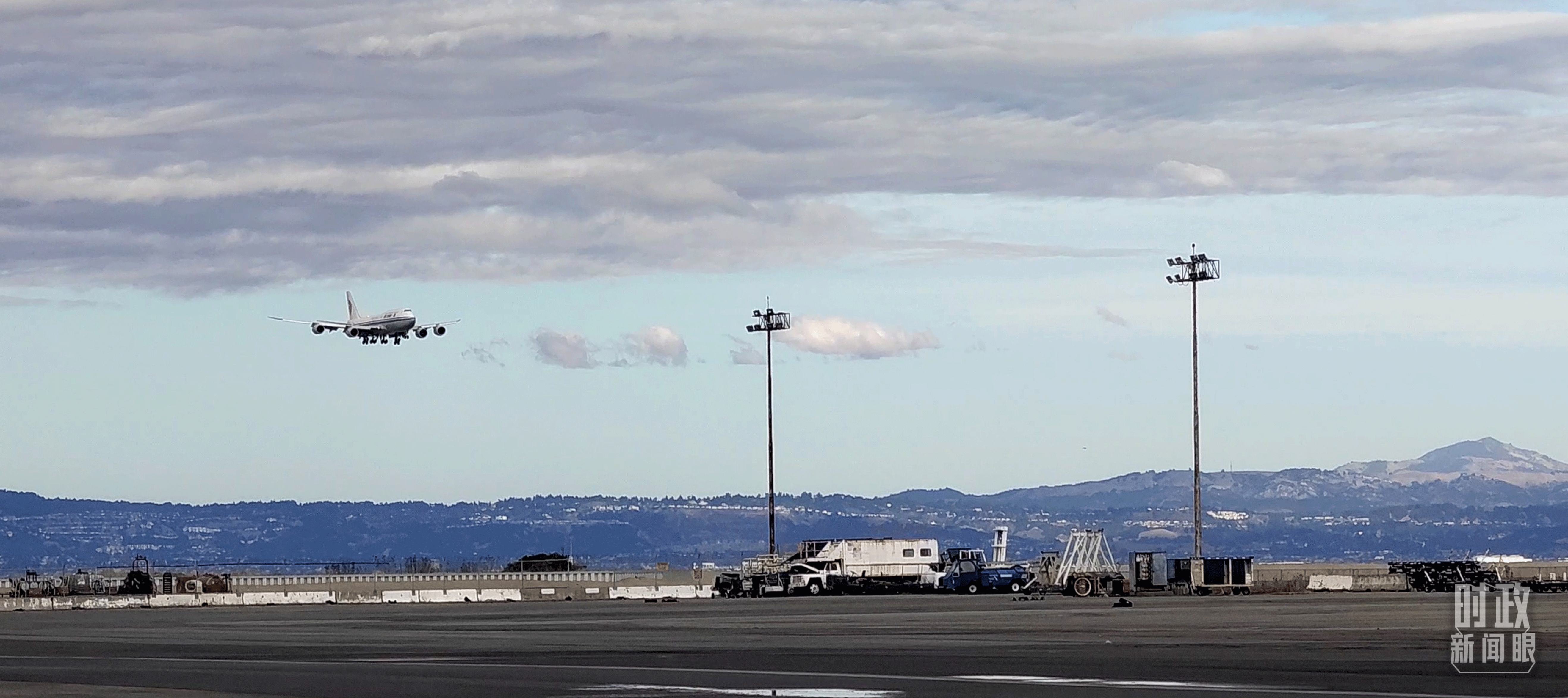 △習(xí)近平乘坐的專機(jī)即將降落舊金山國際機(jī)場。(總臺(tái)央視記者張曉鵬拍攝)