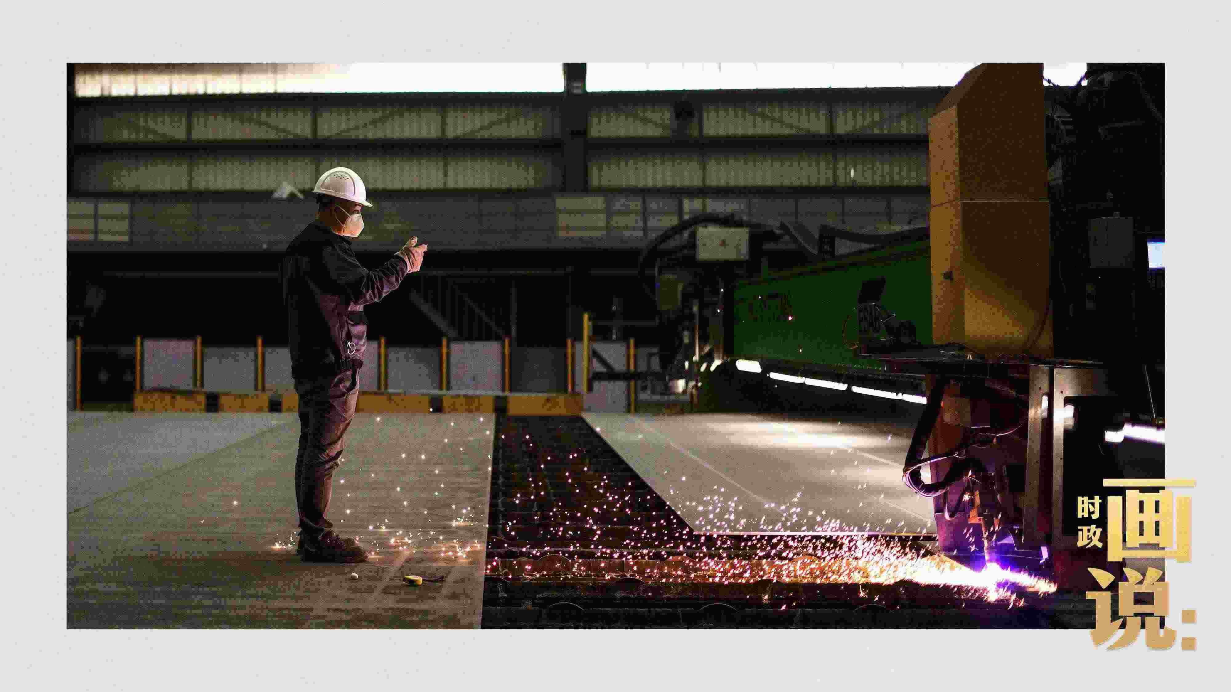 △薄板智能生產(chǎn)中心內(nèi),激光切割機正在將特種鋼板加工成標準零件。浦東新區(qū),上海。