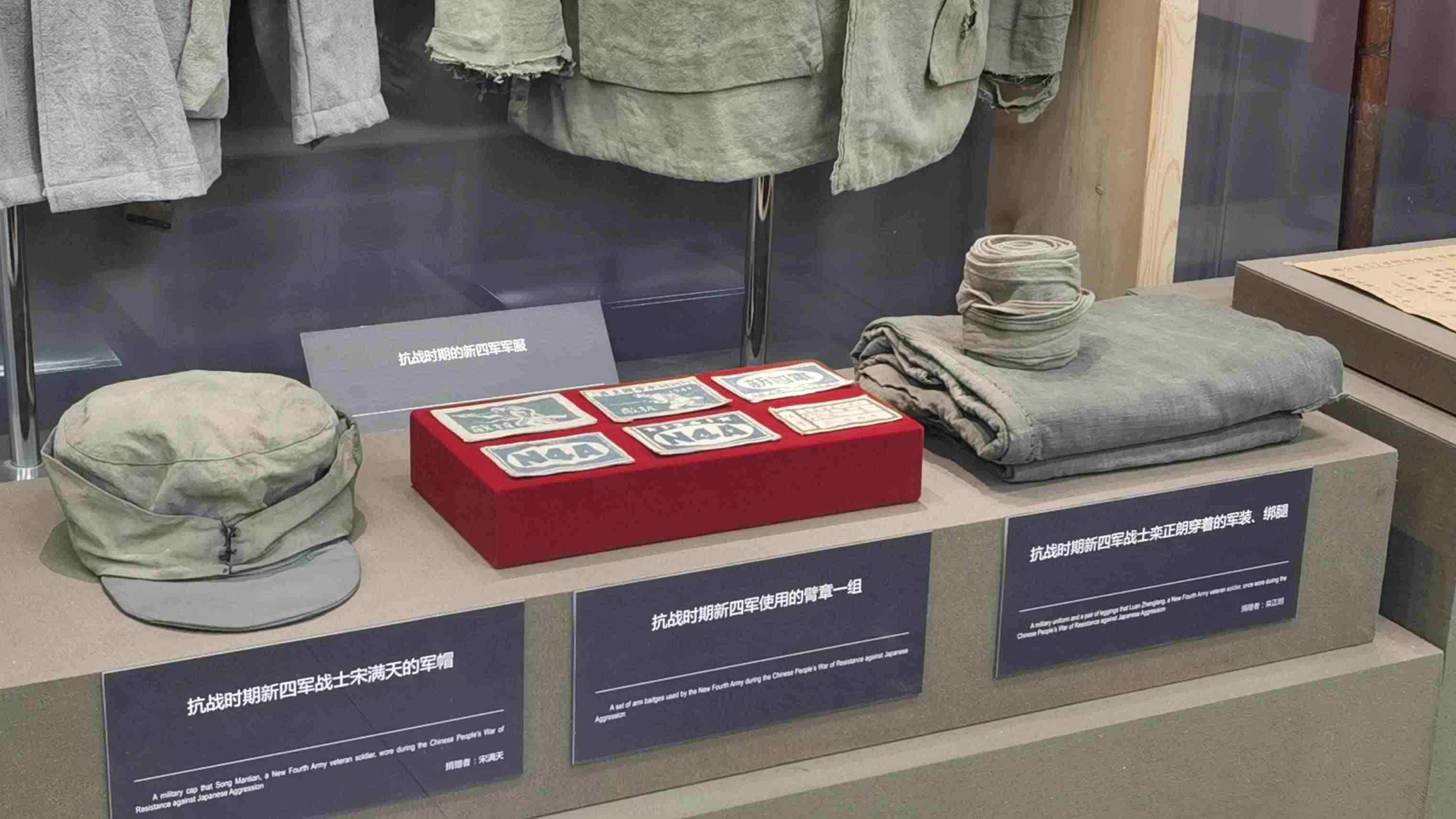 △抗戰(zhàn)時期新四軍使用的軍帽、臂章等。(總臺央視記者郭鴻拍攝)