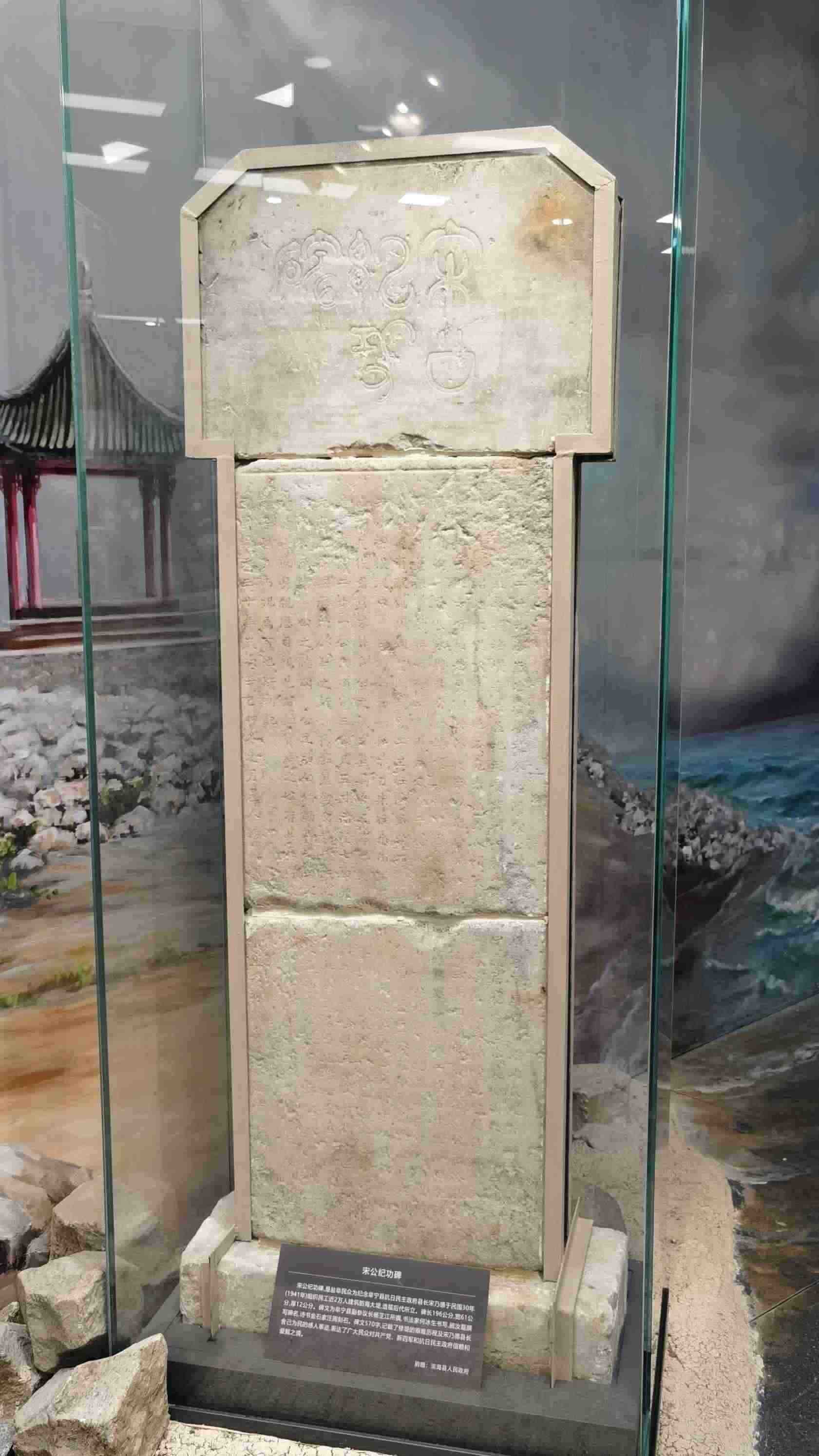 △新四軍紀(jì)念館里的宋公紀(jì)功碑。此碑是鹽阜民眾為紀(jì)念阜寧縣抗日民主政府縣長宋乃德于1941年組織修筑海防大堤所立。碑文記載了修筑大堤的艱難歷程,表達(dá)了鹽阜民眾對共產(chǎn)黨、新四軍和抗日民主政府的信賴和愛戴之情。(總臺央視記者郭鴻拍攝)