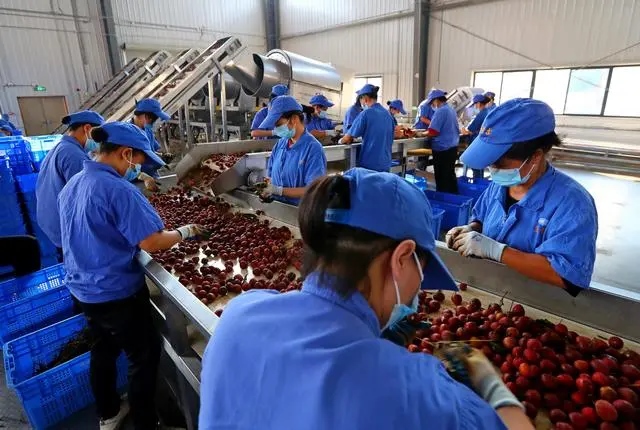 △工人們在廣東茂名一荔枝產(chǎn)業(yè)園生產(chǎn)車間工作。這里的荔枝清汁生產(chǎn)線每天可處理200噸荔枝鮮果。