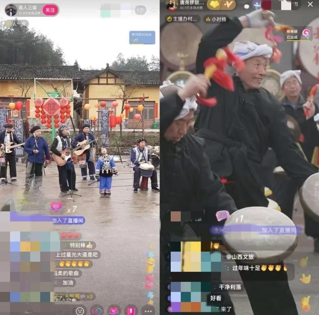 湖南省鳳凰縣臘爾山鎮(zhèn)苗寨中,4個“90后”苗族小伙組成樂隊(duì)自辦“村晚”,規(guī)模不大,唱火家鄉(xiāng);山西臨汾的村民們用簸箕、黃豆當(dāng)樂器,配合嗩吶和非遺晉南威風(fēng)鑼鼓,直播連線上千公里外的苗鄉(xiāng),南北大聯(lián)歡釋放獨(dú)特的精彩,吸引在線觀眾近800萬人……