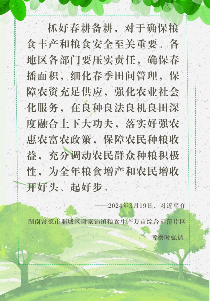 ??3月19日下午,習(xí)近平總書記來到湖南常德市鼎城區(qū)謝家鋪鎮(zhèn)糧食生產(chǎn)萬畝綜合示范片區(qū),走進(jìn)水稻田邊,察看秧苗培育和土地翻耕情況,并同種糧大戶、農(nóng)技人員、基層干部和村民親切交流,詳細(xì)詢問春耕備耕等情況。 ??“農(nóng)者,天下之本也?!?/p> ??在常德市鼎城區(qū)謝家鋪鎮(zhèn)港中坪村,農(nóng)民搶抓農(nóng)時,整備農(nóng)機(jī)、備足農(nóng)資,開展春耕生產(chǎn),播種豐收的希望。 ??3月19日,在港中坪村,村民駕駛農(nóng)機(jī)翻耕田地(無人機(jī)照片)。 ??3月19日,在港中坪村,村民駕駛農(nóng)機(jī)翻耕田地(無人機(jī)照片)。 ??3月19日,在港中坪村,村民駕駛農(nóng)機(jī)翻耕田地。 ??3月19日,在港中坪村,村民駕駛農(nóng)機(jī)翻耕田地。 ??3月19日,在港中坪村,村民駕駛農(nóng)機(jī)翻耕田地。 ??3月19日,在港中坪村,村民在疏通田間的水渠。 ??3月19日,在港中坪村,村民駕駛農(nóng)機(jī)翻耕田地。 ??監(jiān)制:郭建業(yè) ??策劃:賴向東 ??統(tǒng)籌:畢曉洋 徐亮 ??編輯:侯俊 李琰 張曼怡 杜瀟逸 ??攝影:鞠鵬 謝環(huán)馳 王曄 燕雁 薛宇舸 陳思汗 盧燁 ??新華社攝影部、湖南分社聯(lián)合制作 ??新華社第一工作室出品