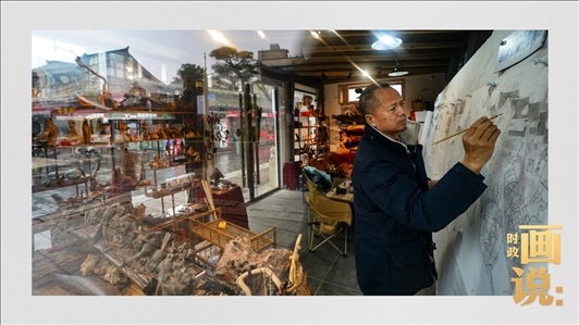 △安鄉(xiāng)潘氏藝術(shù)木雕傳承人潘能輝在繪制手稿。