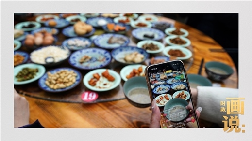 △游客用鏡頭記錄下豐盛的擂茶“壓桌菜”。2009年,擂茶習(xí)俗列入第三批“湖南省非物質(zhì)文化遺產(chǎn)代表性項(xiàng)目名錄”。