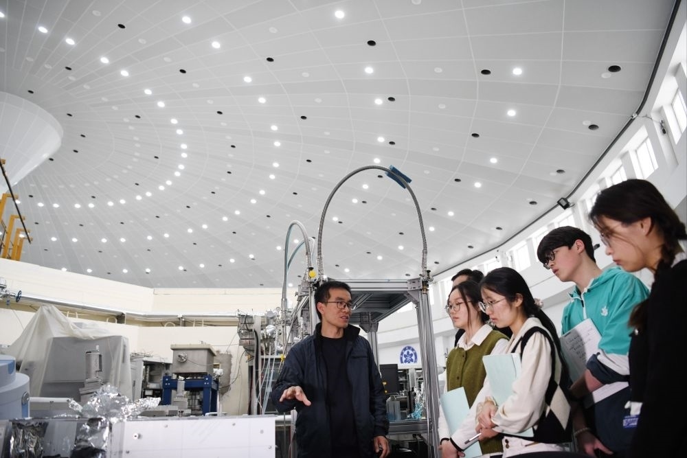 在中國科學(xué)技術(shù)大學(xué)國家同步輻射實驗室,安徽省先進功能高分子薄膜工程實驗室團隊成員崔昆朋教授(左一)同學(xué)生交流(2024年4月6日攝)。新華社記者 張端 攝
