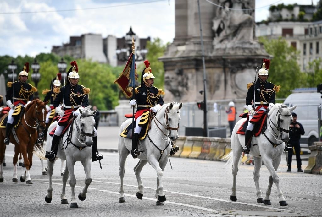 歡迎儀式后,習(xí)近平和夫人彭麗媛在共和國(guó)衛(wèi)隊(duì)148名騎兵組成的禮兵馬隊(duì)和摩托車隊(duì)護(hù)衛(wèi)下,乘車前往愛麗舍宮。
