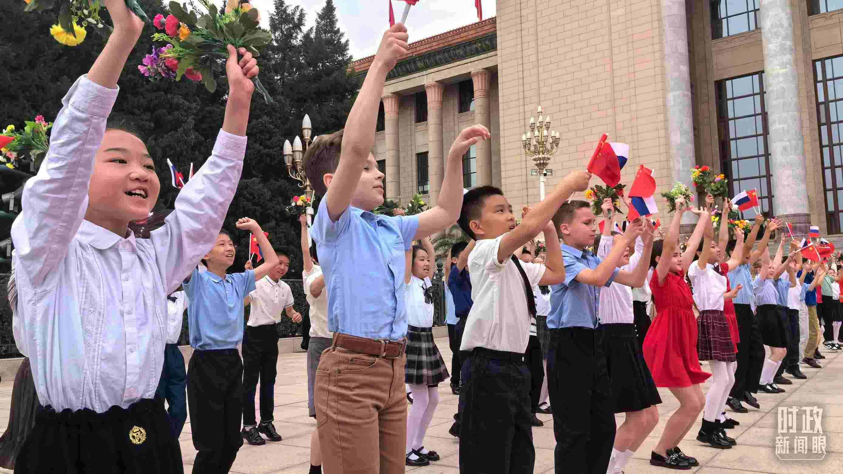△歡迎儀式現(xiàn)場(chǎng)的中俄少年兒童。(總臺(tái)央視記者王子杭、段德文拍攝)