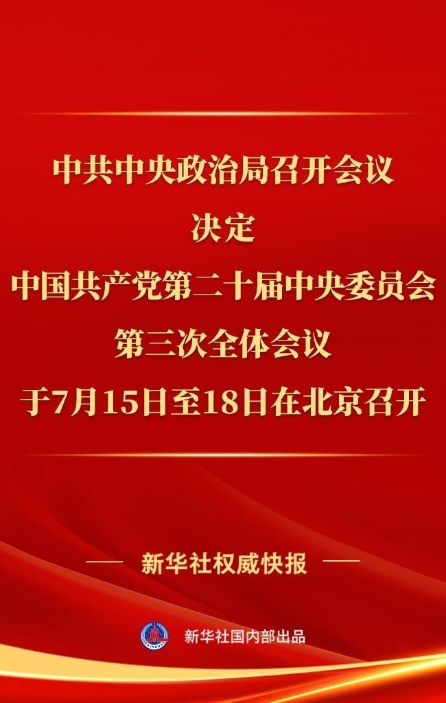 中共中央政治局召開會議,決定中國共產(chǎn)黨第二十屆中央委員會第三次全體會議于7月15日至18日在北京召開