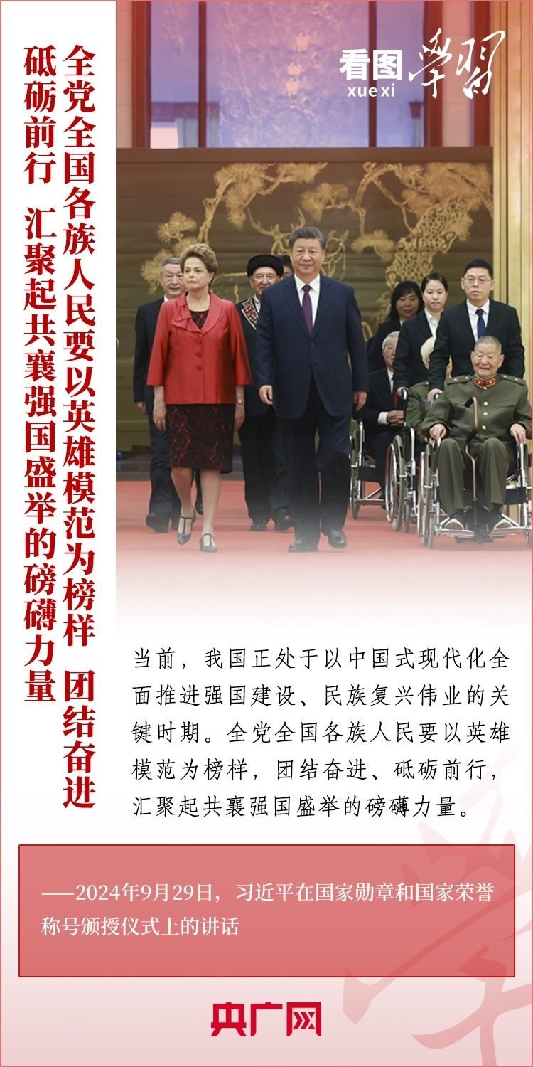 9月29日,中華人民共和國國家勛章和國家榮譽(yù)稱號(hào)頒授儀式在北京舉行,習(xí)近平總書記向國家勛章和國家榮譽(yù)稱號(hào)獲得者頒授勛章獎(jiǎng)?wù)虏l(fā)表重要講話??倳洀?qiáng)調(diào),全黨全國各族人民要以英雄模范為榜樣,團(tuán)結(jié)奮進(jìn)、砥礪前行,匯聚起共襄強(qiáng)國盛舉的磅礴力量。一起來學(xué)習(xí)!