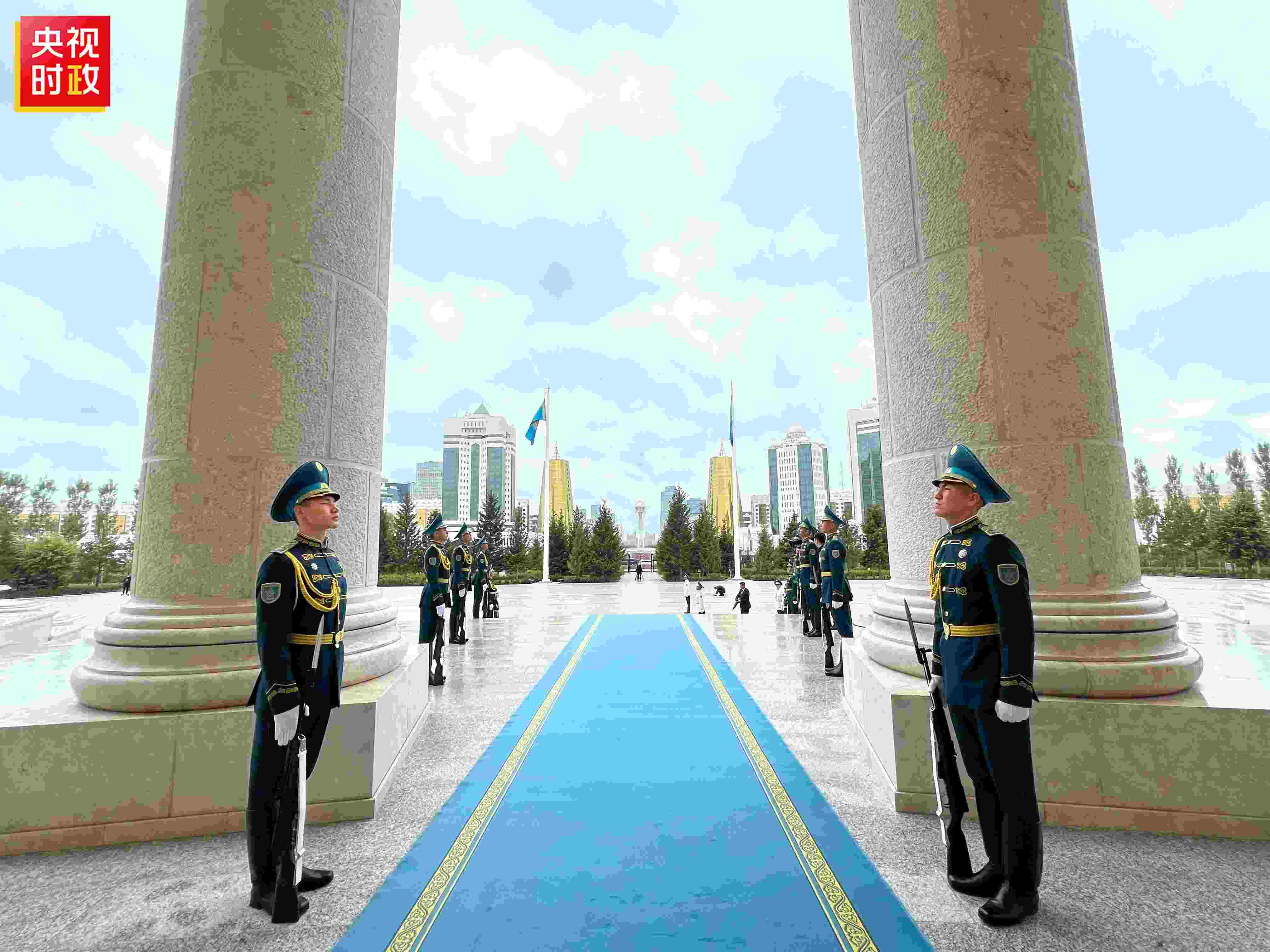 當?shù)貢r間7月3日上午,國家主席習近平乘專車抵達總統(tǒng)府,托卡耶夫總統(tǒng)在下車處熱情迎接。