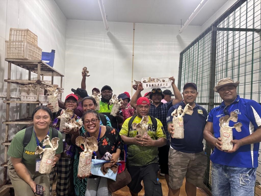 2月28日,在斐濟(jì)楠迪,培訓(xùn)班學(xué)員手捧菌草菇合影。新華社發(fā)(中國援斐濟(jì)菌草技術(shù)示范中心供圖)