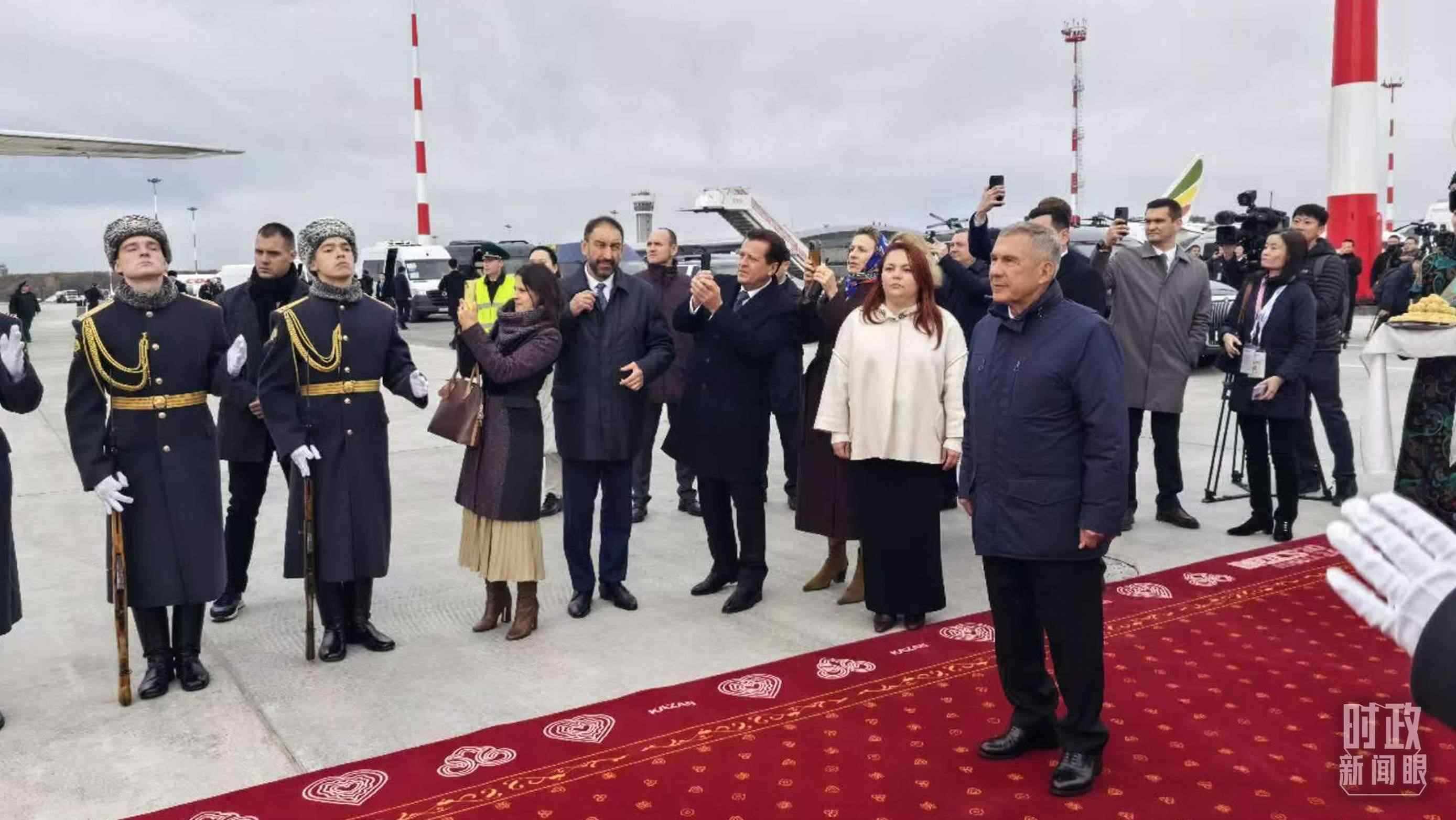 △ 習(xí)主席專機(jī)抵達(dá)喀山國(guó)際機(jī)場(chǎng)時(shí),俄羅斯聯(lián)邦韃靼斯坦共和國(guó)行政長(zhǎng)官等在機(jī)場(chǎng)熱情迎接。(總臺(tái)央視記者王鵬飛拍攝)