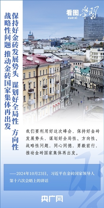 當地時間10月23日,國家主席習近平在俄羅斯喀山出席金磚國家領導人第十六次會晤并發(fā)表重要講話。習主席深刻闡述推動“大金磚合作”高質量發(fā)展的中國主張,就金磚大家庭發(fā)展合作提出五點務實舉措,表達了中方愿同金磚各國一道,攜手更多“全球南方”國家共同推動構建人類命運共同體的真誠愿望。一起來學習!