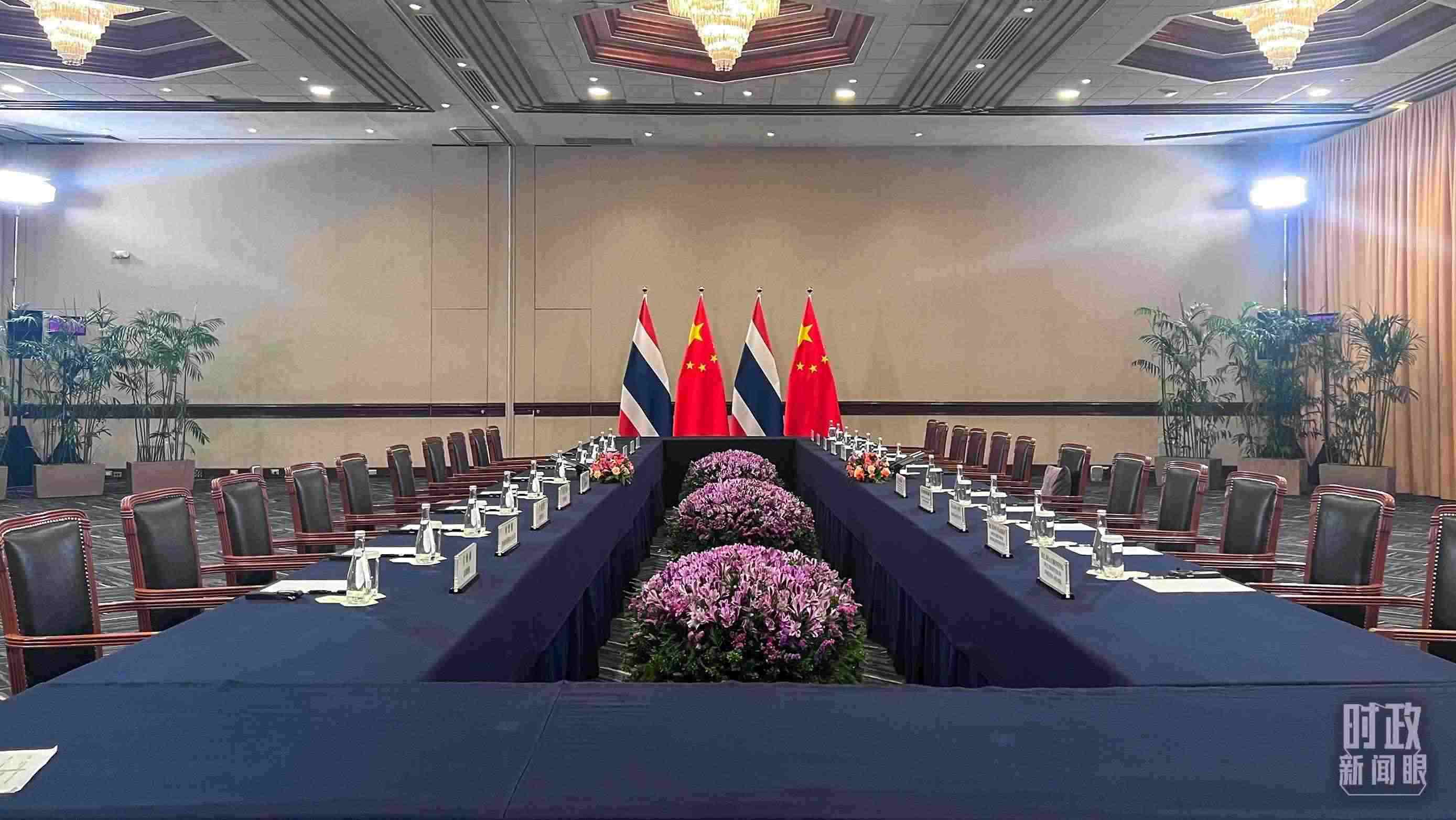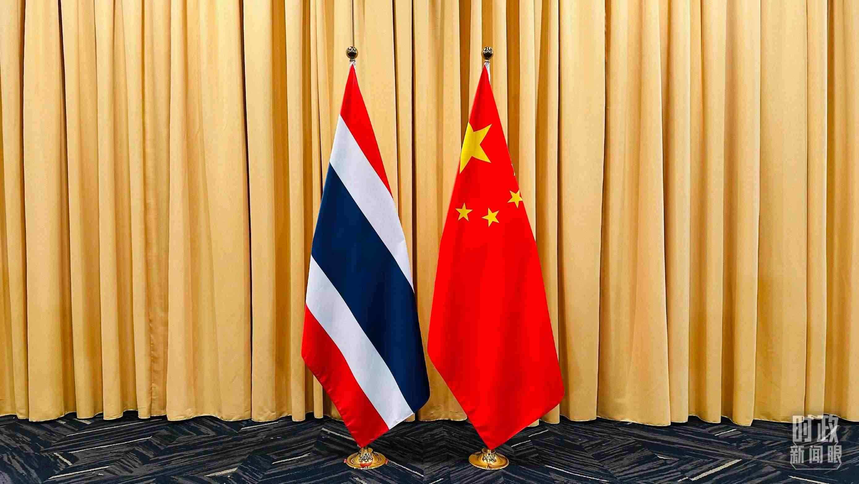 △會(huì)見現(xiàn)場(chǎng)的中泰兩國(guó)國(guó)旗。(總臺(tái)央視記者范一鳴拍攝)