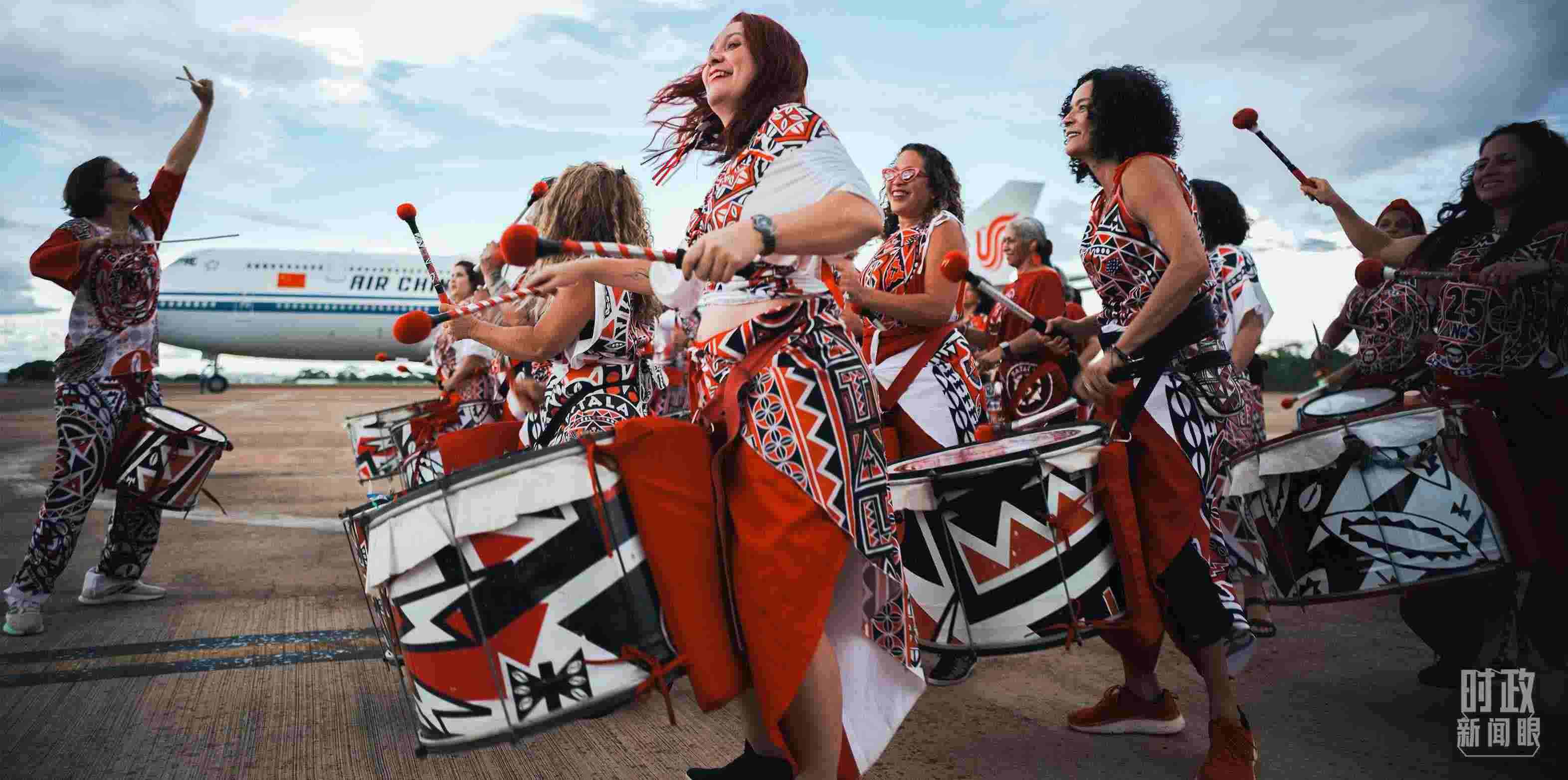 △習(xí)主席乘專機(jī)抵達(dá)巴西利亞,藝術(shù)家演奏特色鼓樂(lè)。(總臺(tái)央視記者彭漢明拍攝)