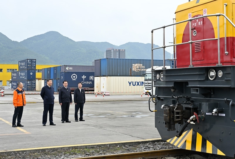△ 2024年4月22日,習近平總書記在重慶國際物流樞紐園區(qū)重慶鐵路集裝箱中心站考察。
